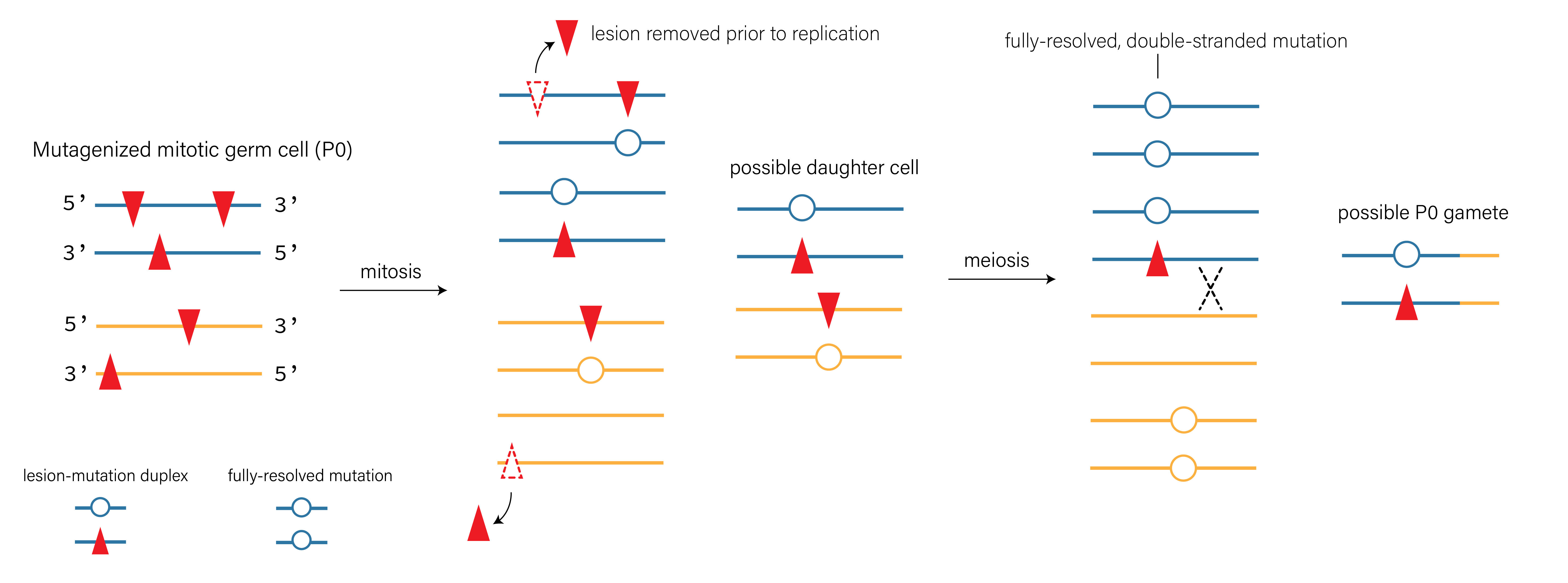 Critically, if a haploid gamete harbors a lesion-containing strand, that lesion might end up in a fertilized zygote. And if it’s present in a fertilized zygote, there’s a chance it would end up in the P4 cell that gives rise to all germ cells in the F1 animal (see Figure 8).