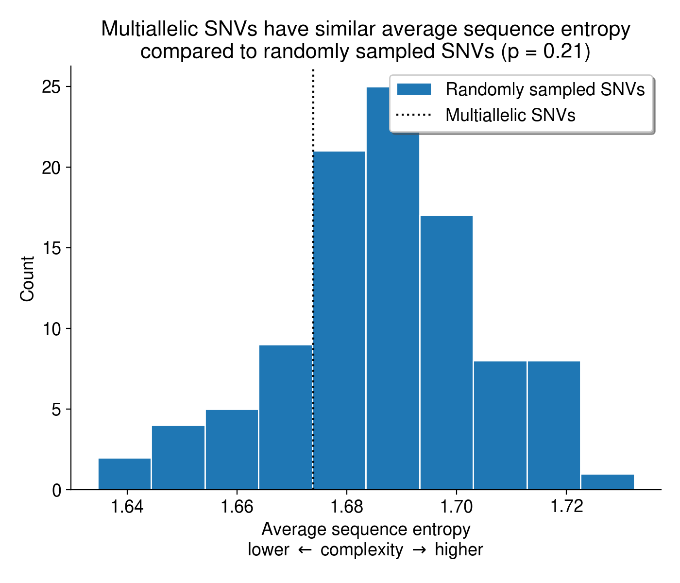Another possible explanation for these multi-allelic mutations is that tools like BWA-MEM struggle to align reads in low-complexity, repetitive sequence, introducing base mismatches in the process. To check if this might be the case, I calculated the entropy of the sequence context surrounding every detected SNV in the dataset. Overall, the sequence context surrounding multi-allelic mutations is no less complex than the context surrounding bi-allelic mutations (Figure 6).
