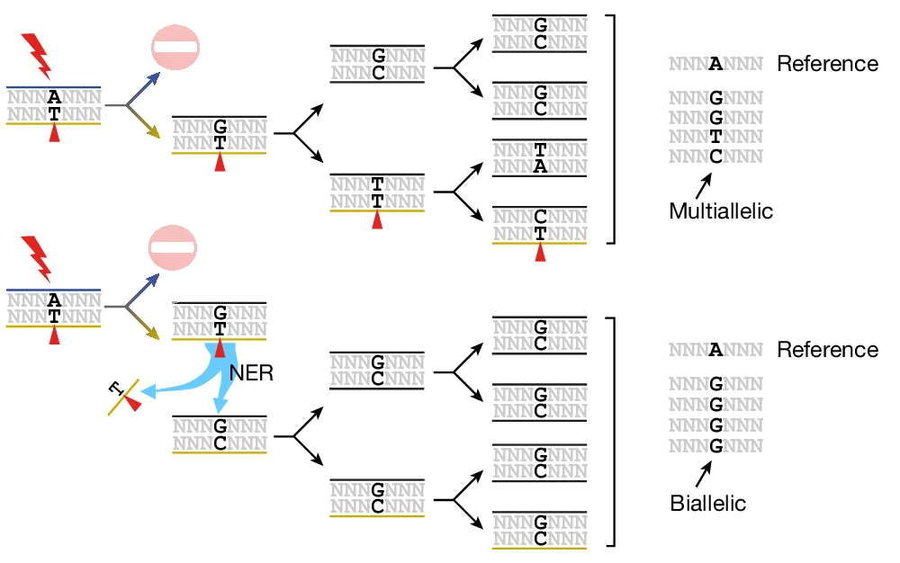 Also in 2020, Aitken et al.2 mutagenized over 200 mice with a potent DNA damage agent called DEN. By analyzing the specific nucleotide changes (e.g., A\(\rightarrow\)T vs. T\(\rightarrow\)A) created by single-nucleotide variants in these mutagenized mice, the authors observed a phenomenon they termed “lesion segregation.” “Lesion segregation” occurs when mutagenic lesions persist for at least one cell division following an initial burst of mutagen exposure. In that and many follow-up papers3, Aitken and colleagues discovered that persistent DNA lesions are engines of multi-allelic variation (see Figure 2).