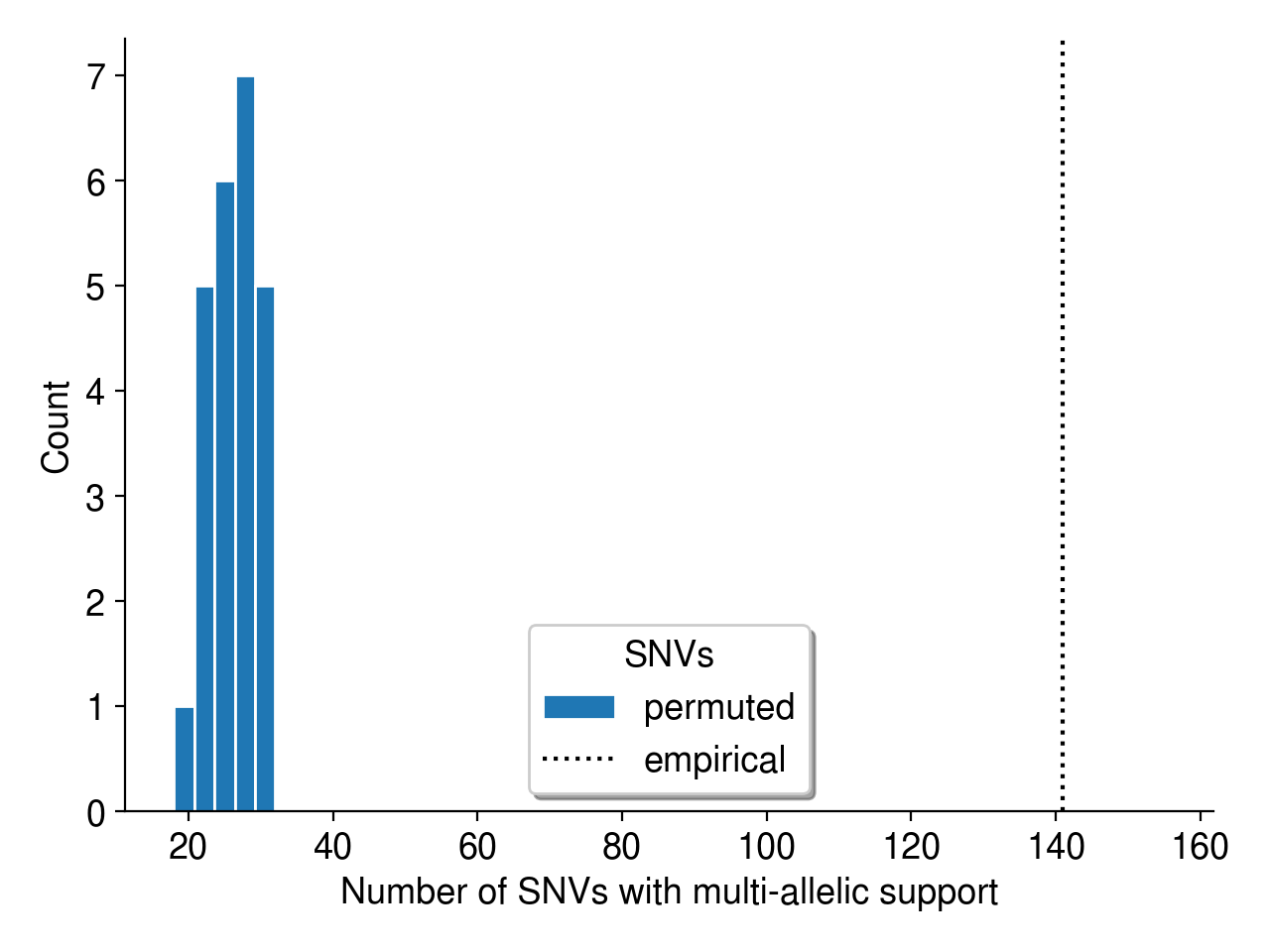 Using the same permutation strategy as described above, I also calculated the amount of reads supporting the “extra” allele at each multi-allelic SNV. As expected, the “real” multi-allelic mutations are supported by many more reads than the permuted sites (Figure 5)