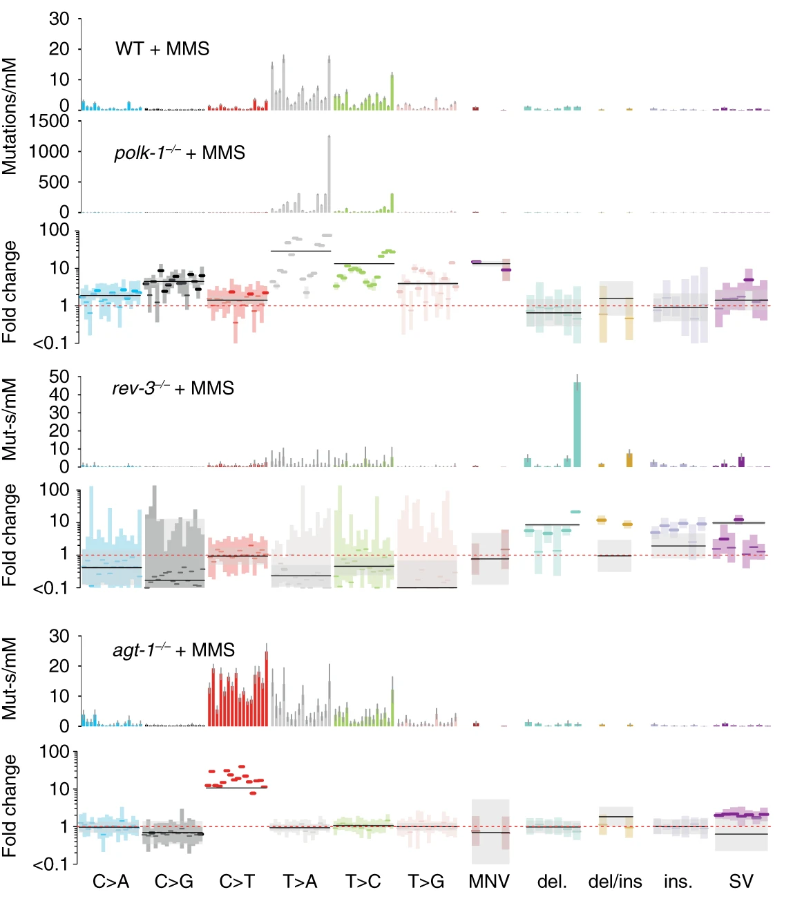 agt-1 alkyltransferase LOF mutants. agt-1 mutants cannot remove rare \(O^6\)-methylguanine lesions caused by MMS, resulting in an excess of C\(\rightarrow\)T mutations absent from WT strains. (Volkova et al. 2020, Nature Communications)